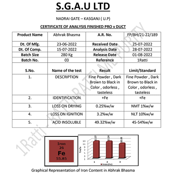 1Ratti Abhrak Bhasma is an ayurvedic formulation of mica and other indigenous drug juices that are helpful for respiratory health and chronic cough. It offers energy to the body and has a calming effect.