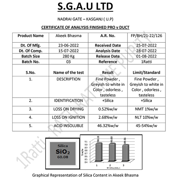 1Ratti Akeek Bhasma is an ayurvedic cooling medicine that acts against several issues, including digestive problems. It deals with heart trouble, acidity, heartburn or headache. It may also prove beneficial in eye complaints and infections.