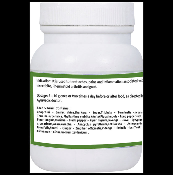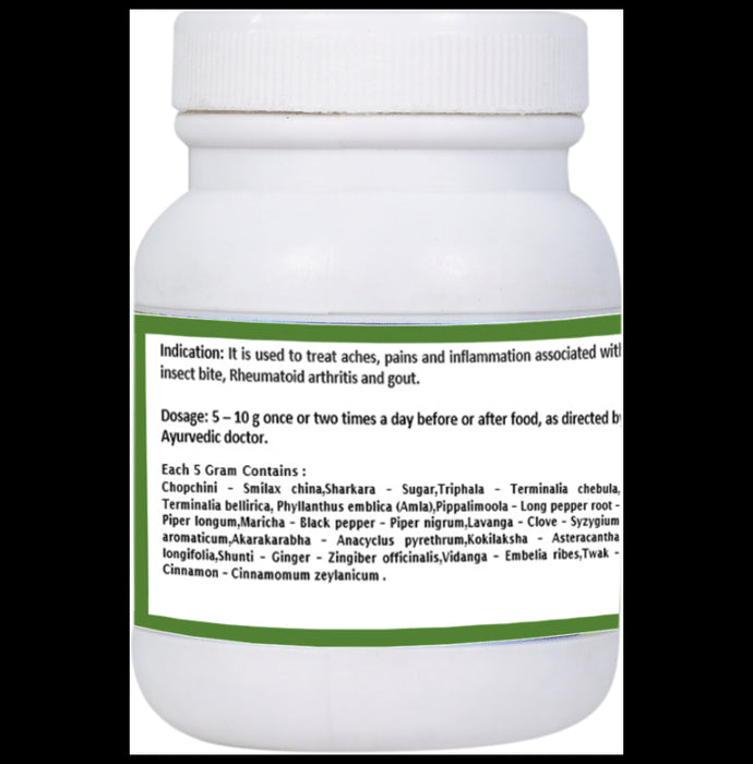 Composition : chopchini (Smilax china), Sharkara (Sugar), Triphala (Terminalia chebula and Temilnalia billerica), Phyllanthus embelica (Amla), Pippal moola (Longpepper root), Piper longum, Maricha - Black pepper- Piper nigrum, Lavanga - Clove, Akarkarabha- Anacyclus pyrethrum, Kokilaksha - Asteracantha aromaticum, Akarkarabha - Anacyclus pyrethrum, Kokilaksha (Asteracantha longofloia), Shunti- Zingiber officinalis, Vidanga Embelia ribes, Twak - Cinnamon -Cinnamomum zeylanicum