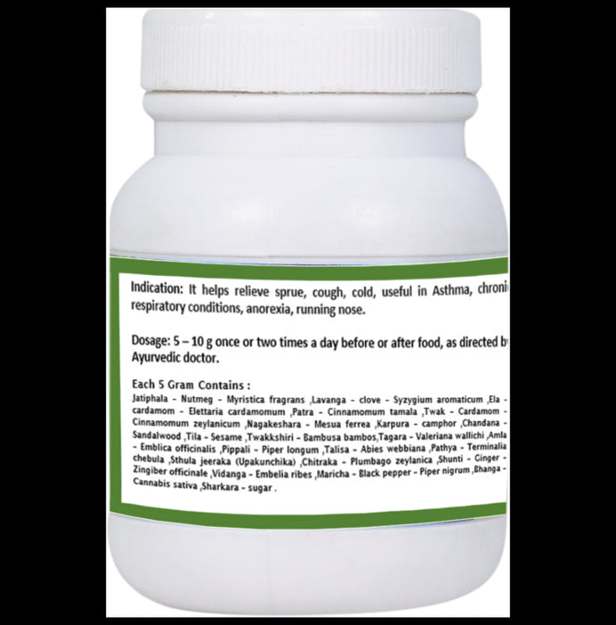 Composition : Jaiphala-Nutmeg-Myristica fragrans, Lavanga-Clove-Syzygum aromaticuam, Elaichi- Cardamom- Elettaria cardamomum, Patra- Cinamomum tamala, Twak-Cardamomum- Cinnamomum zeylanicum, Nagkeshara- Mesua ferrea, Karpura- Camphor, Chandana- Sandalwood, Tila- Sesame, Twakshiri- Bambosa bambos, Tagara- waleeriana valiichi, Amla- Embelica officinalis, Pippali- Piper longum, Talisa- Abis webbiana, Pathya- Terminalia chebula, Sthula-jeeraka, Chitraka- Plumbago zeylanica, Shunti-Ginger- Zingeber officinalis, Vidanga- Embelia ribes, Maricha- Black pepper- Piper Nigrum, Bhanga-Cannabis sativa, Shakarkara- Sugar