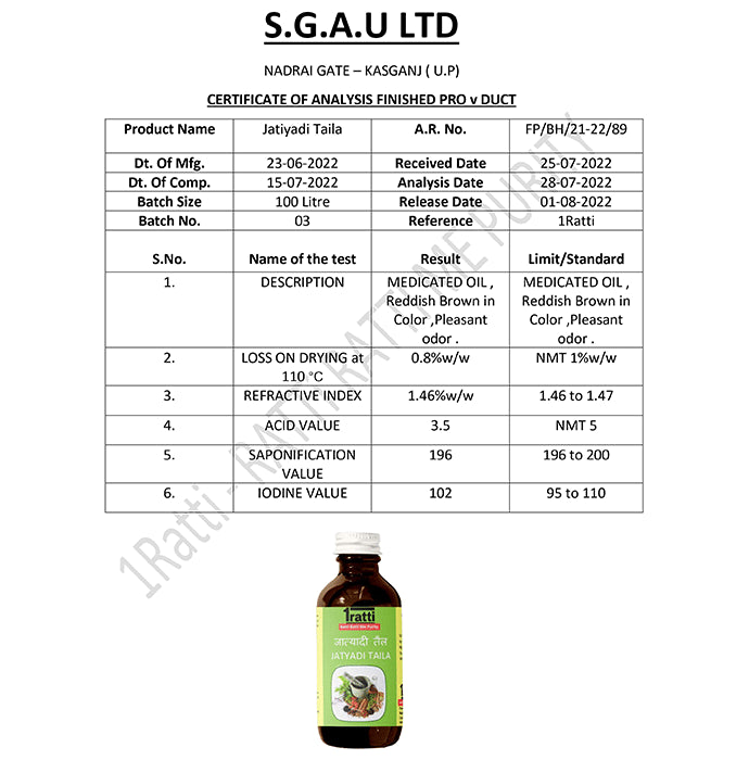 1ratti Jatyadi Taila is an ayurvedic herbal oil used to combat various external wounds. Til tail has been used as a base oil in this product. Jatyadi oil contains flavonoids, essential oils, tannins, glycosides and alkaloids, which help in the faster evaporation of wounds. This oil is cooling, anti-microbial, anti-bacterial and non-irritant.