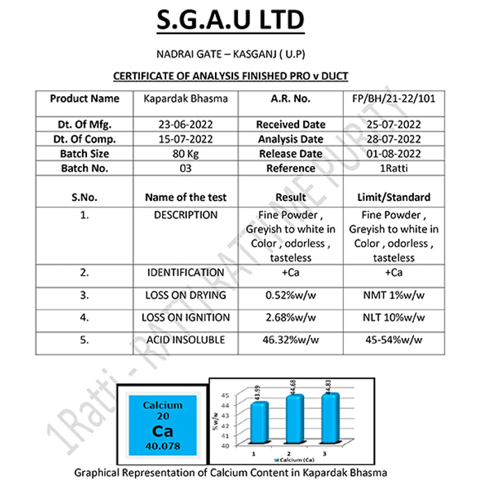 1Ratti Kapardak Bhasma is an ayurvedic formulation obtained by calcinating cowries, a carbonate of calcium. It has antacid, alterative, diuretic, anti-diarrheic, digestive and expectorant properties. It may help deal with indigestion, ulcers and cough and cold.