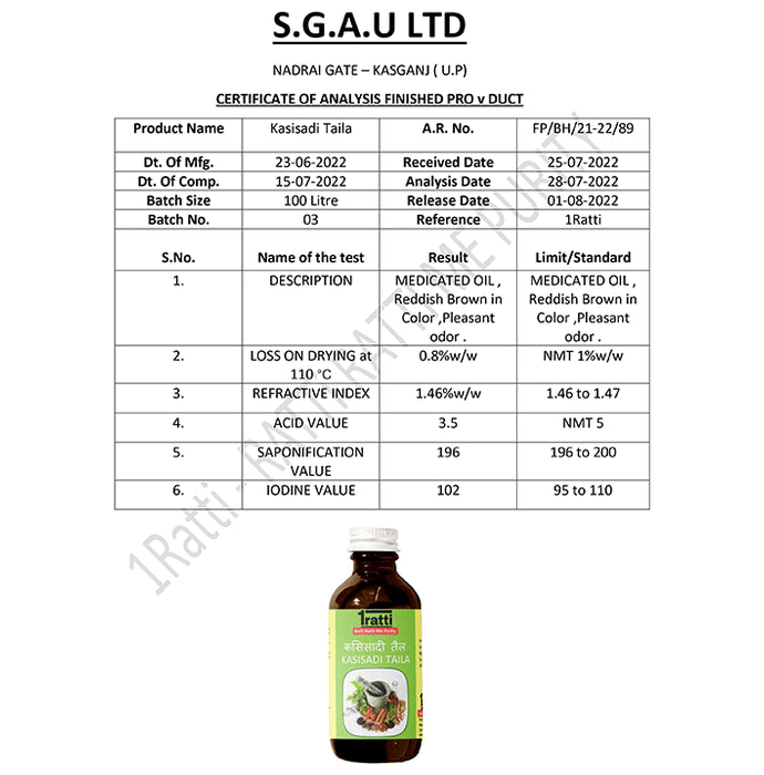 1ratti Kasisadi Taila is a polyherbal medicated ayurvedic oil that can be used for external application on piles, corns and warts. It has antiseptic and disinfectant activities. Regular topical application of this oil for a few weeks helps soften the haemorrhoids, corns and warts and reduce their size.