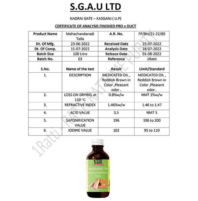1ratti Mahachandanadi Taila acts as an antiseptic. The massage of this oil is effective in chronic fever. This is also useful in cases of burning sensations in the legs, headache and neuralgia.