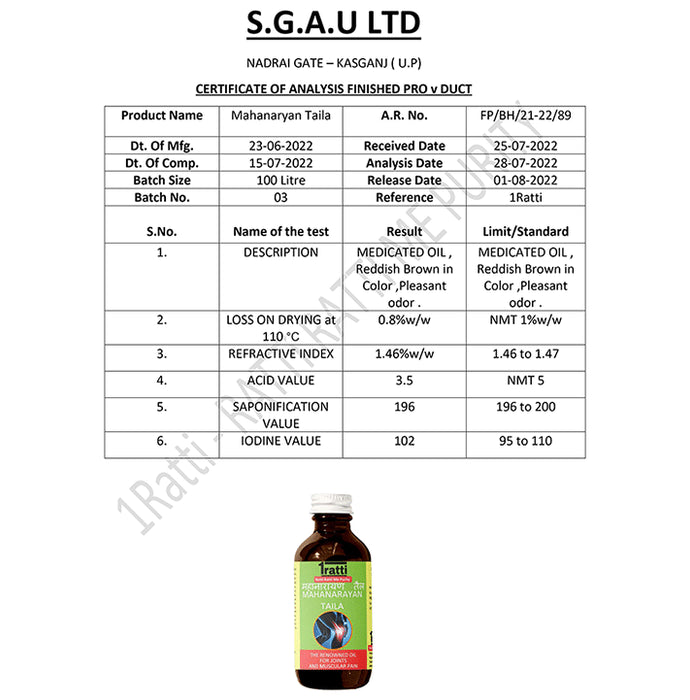 1ratti Mahanarayan Taila is a herbal and ayurvedic oil. It is used to combat arthritis and different types of eye diseases. This oil is for external application and is also effective in ayurvedic therapies.