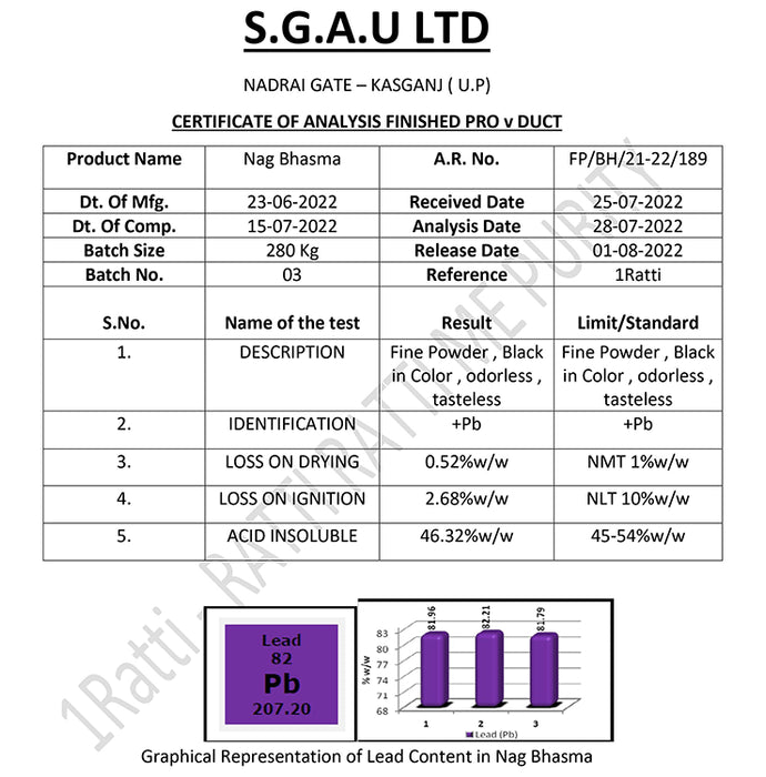 1Ratti Nag Bhasma is an ayurvedic mineral-based formulation with lead calx as the prime ingredient purified using indigenous herbal extracts. It is used primarily in the management of digestive disorders. It can help maintain your vitamin and mineral levels, making you less anaemic.It can help manage piles and the pain and discomfort associated with it. It can also help fight anaemia and other deficiencies.