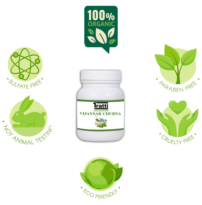 1Ratti Vijaysar Powder is an ayurvedic single drug formulation with vijaysar as the only ingredient, which helps manage metabolic disorders and helps check the blood sugar levels in the body. It also helps maintain a healthy weight with its antioxidant and anti-inflammatory properties.