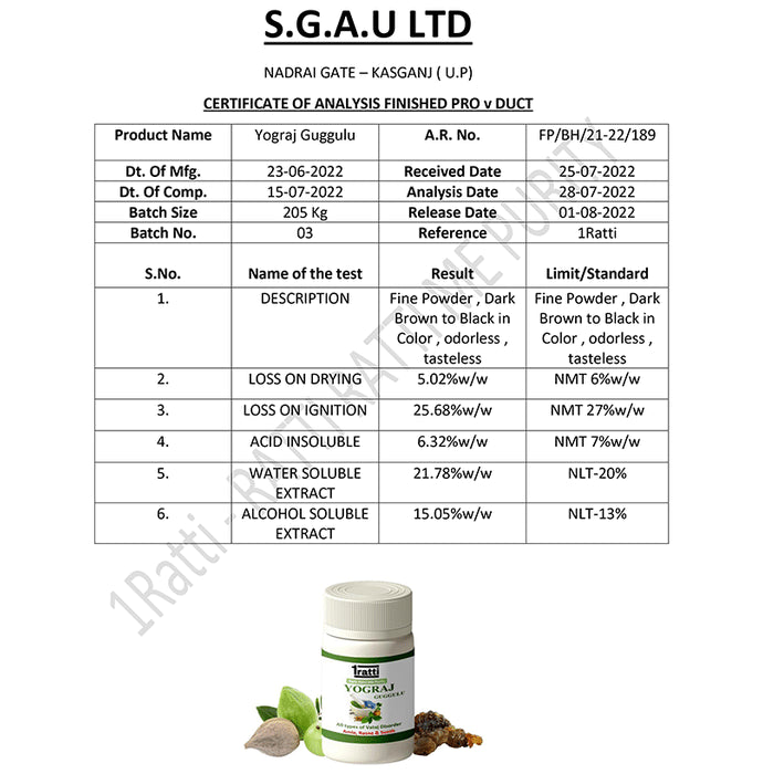 1Ratti Yograj Guggulu is an ayurvedic guggul preparation used in pain disorders, strain, sprain, breathing troubles, etc. Sprain, strain, and inflammation are specific disorders in today's fast life. Baidyanath Yograj Guggulu helps reduce stiffness, pain and swelling in joint diseases. It is also a rejuvenating supplement and supportive therapy in Ayurveda for various conditions.