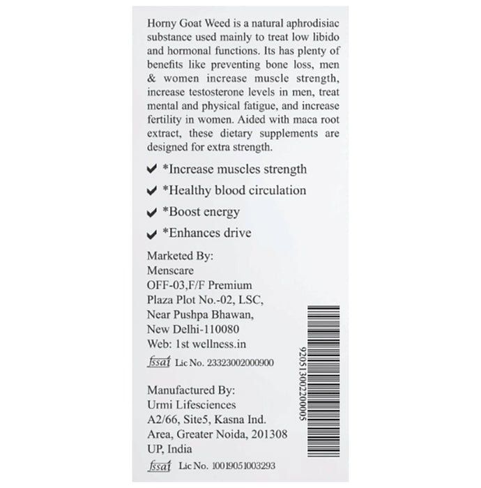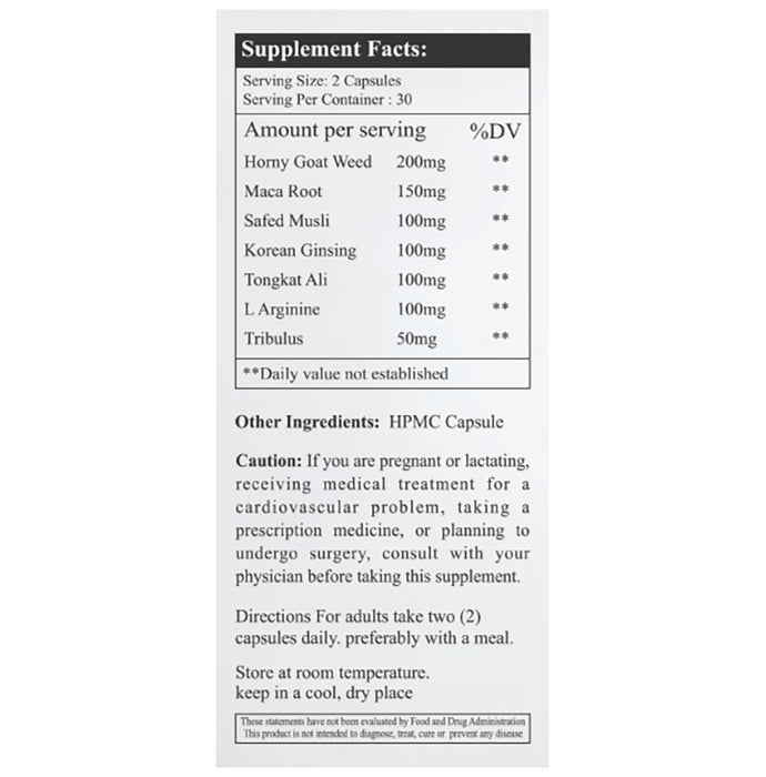 Composition : Horny Goat Weed,Maca Root,Safed Musli,Korean Ginseng,Tongkat Ali,L Arginine,Tribulus