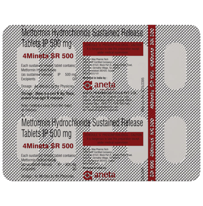 4Mineta SR 500 Tablet is a medicine used to treat type 2 diabetes mellitus. It helps control blood sugar levels and thus prevent serious complications of diabetes. It is also used to treat a menstruation-related disorder known as Polycystic ovary syndrome (PCOS) in women. 4Mineta SR 500 Tablet is best taken with food to avoid nausea and abdominal pain. You should take it regularly, at the same time each day, to get the most benefit. You should not stop taking this medicine unless your doctor recommends it. Your lifestyle plays a big part in controlling diabetes. Therefore, it is important to stay on the diet and exercise program recommended by your doctor while taking this medicine. The most common side effects of this medicine include diarrhea, nausea, vomiting, flatulence, weakness, indigestion, abdominal discomfort, headache, and loss of appetite. Some people may develop hypoglycemia (low blood sugar level) when this medicine is taken along with other antidiabetic medicines, alcohol, or upon skipping a meal. Monitor your blood sugar levels regularly while taking it.Before taking this medicine, inform your doctor if you have any kidney, liver, or heart problems. Pregnant or breastfeeding women should also consult their doctor before taking it. Your doctor will check your kidney function tests before starting treatment with it. Avoid excessive alcohol intake while taking it as this may increase the risk of developing some side effects.