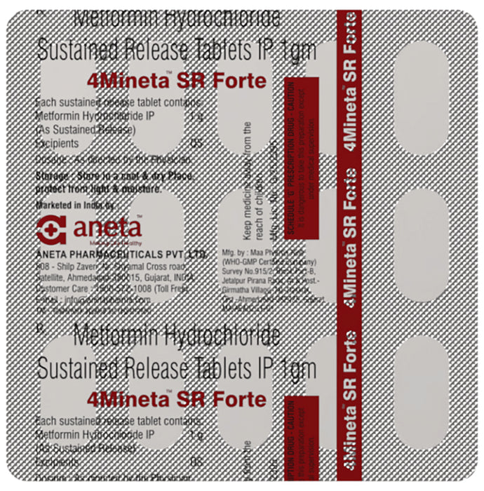 4Mineta SR Forte Tablet is a medicine used to treat type 2 diabetes mellitus. It helps control blood sugar levels and thus prevent serious complications of diabetes. It is also used to treat a menstruation-related disorder known as Polycystic ovary syndrome (PCOS) in women. 4Mineta SR Forte Tablet is best taken with food to avoid nausea and abdominal pain. You should take it regularly, at the same time each day, to get the most benefit. You should not stop taking this medicine unless your doctor recommends it. Your lifestyle plays a big part in controlling diabetes. Therefore, it is important to stay on the diet and exercise program recommended by your doctor while taking this medicine. The most common side effects of this medicine include diarrhea, nausea, vomiting, flatulence, weakness, indigestion, abdominal discomfort, headache, and loss of appetite. Some people may develop hypoglycemia (low blood sugar level) when this medicine is taken along with other antidiabetic medicines, alcohol, or upon skipping a meal. Monitor your blood sugar levels regularly while taking it.Before taking this medicine, inform your doctor if you have any kidney, liver, or heart problems. Pregnant or breastfeeding women should also consult their doctor before taking it. Your doctor will check your kidney function tests before starting treatment with it. Avoid excessive alcohol intake while taking it as this may increase the risk of developing some side effects.