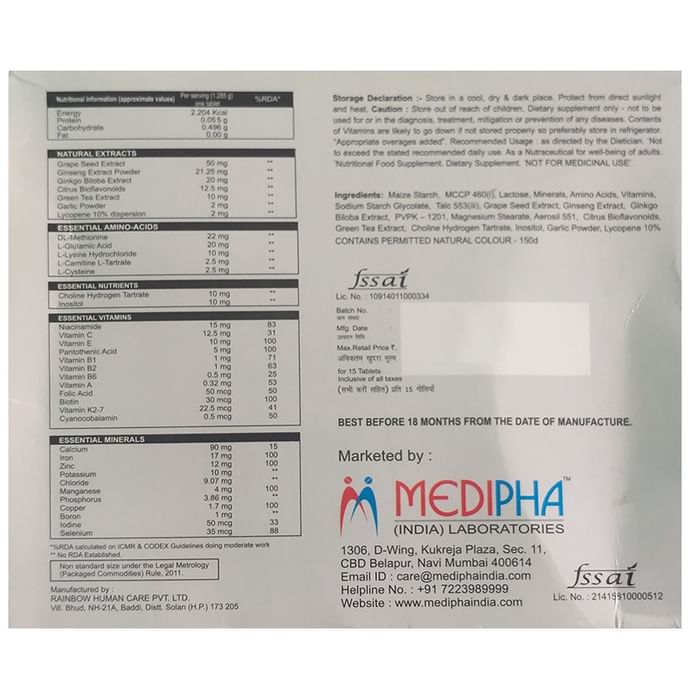 Composition : Grape seed extracts,Green tea extracts,Ginseng,Ginkgo biloba,Garlic,Lycopene,Citrus bioflavonoids,Amino acids,Multivitamins,Multiminerals,Antioxidants