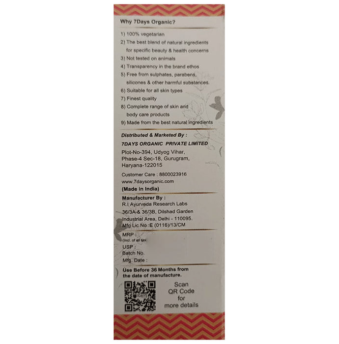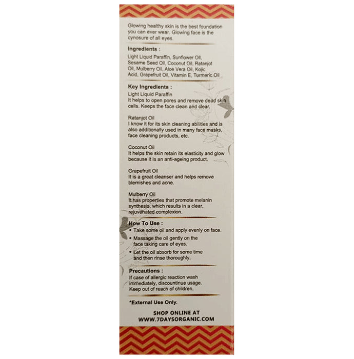 7Days Face Glowing OilIt is a lightweight face oil formulated with turmeric, aloe vera and vitamin C that promotes healthy and glowing skin. It has potent antioxidants that help neutralise free radicals, revive damaged skin cells and reduce visible signs of ageing. It has vitamin C that, boosts collagen production and enhances the skin’s elasticity. It also helps reduce acne and pigmentation and improve skin tone.