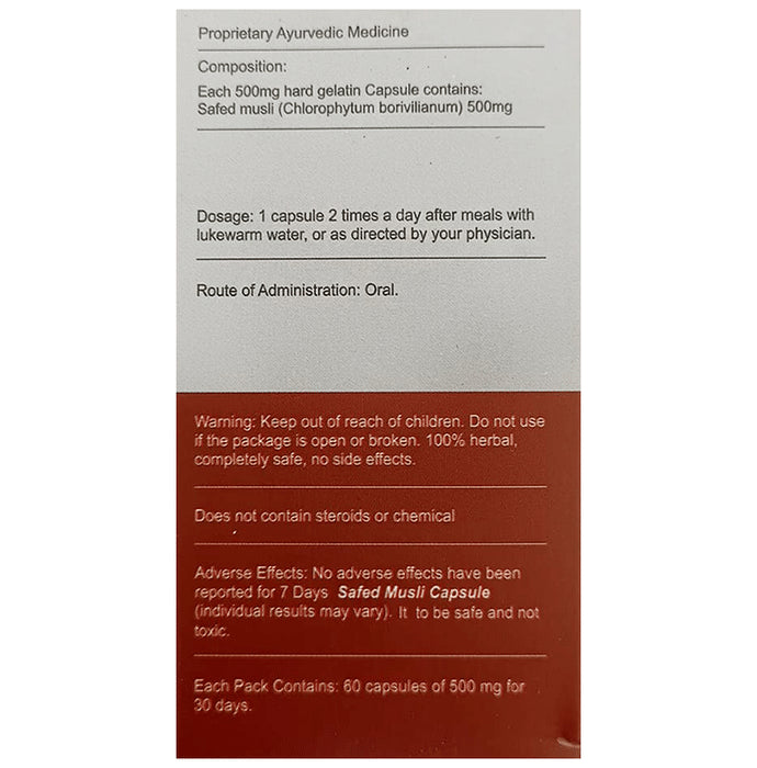 7Days Safed Musli Capsule contains safed musli, a natural herb with over 4,000 years of usage for enhanced performance. It is packed with saponins and glycosides. Safed musli improves vigour, stamina, and strength. It helps to revitalise the body, increase muscle mass and regulate hormones for physical and emotional balance. It is ideal for males for increased energy and stamina. The product contains natural ingredients that do not have any side effects.