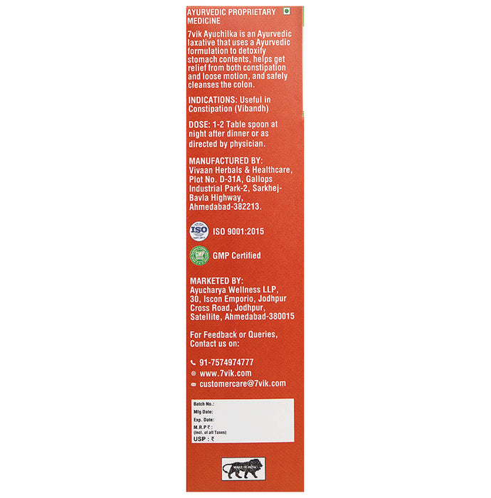 7vik Ayuchilka Isabgol Husk Lemon is an Ayurvedic laxative that uses a natural formulation to potentially help detoxify the stomach contents. It may help relieve constipation and loss of motion while safely cleansing the colon. It is non-habit forming, easy to consume, and flavoured with refreshing lemon to enhance the taste.
