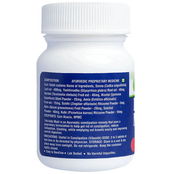 7vik Kabz Mukt Tablet Extra Strong is an Ayurvedic constipation remedy that uses a proprietary formulation which may help relieve constipation, and reduce indigestion, and bloating. It may help to assist in emptying the bowels easily while improving overall digestion. This non-habit-forming and natural product is safe for daily use, helping to support a healthy digestive system.