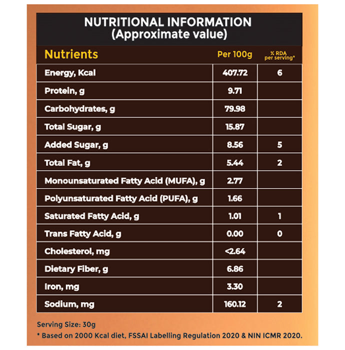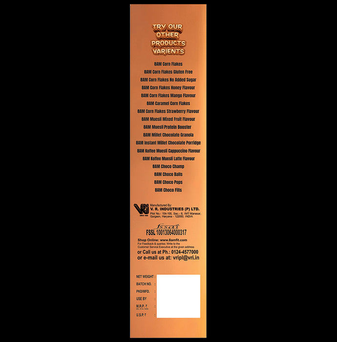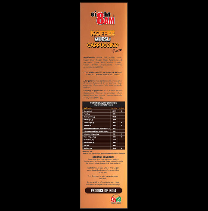 Eight AM Koffee Muesli Indulge in the rich and aromatic flavours of 8AM Koffee-Flavored Muesli, a delightful fusion of coffee indulgence and nutritious goodness. Carefully crafted with wheat flakes, rolled oats, wheat bran, and dried fruits, this muesli offers a satisfying breakfast experience that nourishes the body and tantalises the taste buds. Packed with protein-rich grains, and high fibre content, it provides a balanced and wholesome start to the day.