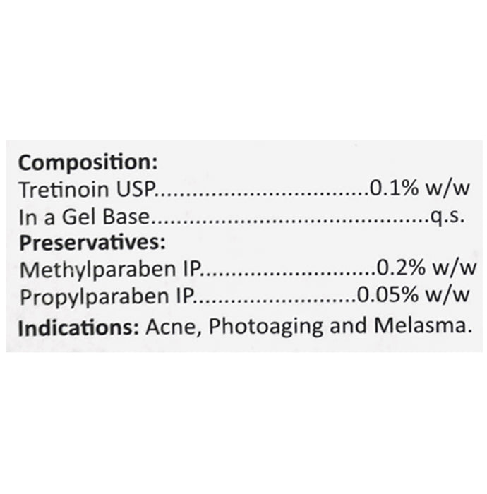A-Ret 0.1% Gel is a form of vitamin A that is used to treat acne which appears as spots or pimples on your face, chest, or back. It also helps to smooth rough facial skin and to reduce fine wrinkles on the skin. A-Ret 0.1% Gel reduces excessive oil production of the skin. Ideally, a pinpoint application at nighttime is recommended for the duration prescribed by your doctor. The amount you need and for how long you need to take it will depend on what you are being treated for. You should normally wash and dry the affected area before applying a thin layer of this medicine. Follow your doctor’s instructions. You should not apply it to damaged or broken skin and avoid contact with your mouth, eyes, and nose. It may take several weeks for your symptoms to improve but keep using it regularly to get the most benefit. Consult your doctor again if you do not notice any improvement after a few weeks. Using more medicine or applying it more often than prescribed will not make it work any faster and may increase the side effects.The most common side effects include irritation, dryness, and redness of the skin. They are usually mild and improve as your body gets used to the medicine. Drink plenty of water and use moisturizer as it may lead to dryness of the mouth, lips, and eyes. Let your doctor know if these side effects bother you or do not go away. Serious side effects with this medicine are rare.This medicine may make you more sensitive to sunlight so you should limit exposure to the sun if possible. It may make your skin more fragile. It is advised, not to have any waxing (hair removal), or laser treatments during treatment. Pregnant women or women who are planning to get pregnant should not use this medicine as it can lead to birth defects.