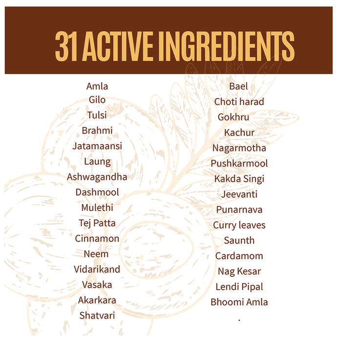 Composition : Amla,Tulsi,Giloy,Ashwgandha,Brahmi,Vidarikand,Mulethi,Cinnamon,Tej patta,Nag kesar,Vasaka,Akarkara,Shatavari