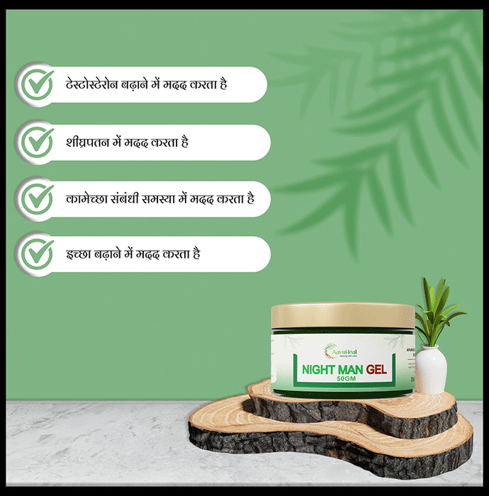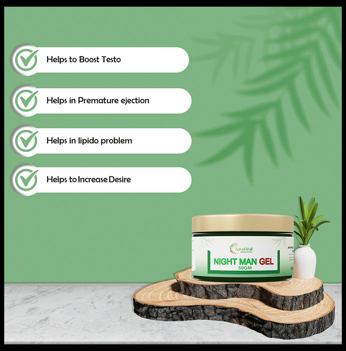 Aayuheal Night Man Gel It improves the blood circulation and increase sensation while also acting as a lubricant. It provides energy and nutrition to the male reproductive system. Key IngredientsThymusCow gheeKey Benefits:It is an ayurvedic product beneficial to improve sexual healthIt may improve overall sexual performanceIt improves the blood circulation and increase sensation while also acting as a lubricantDirections For Use:Use as directed on the lable or as directed by the physicianSafety Information: Store in a cool and dry place away from direct sunlightRead the label carefullyKeep out of reach of the children