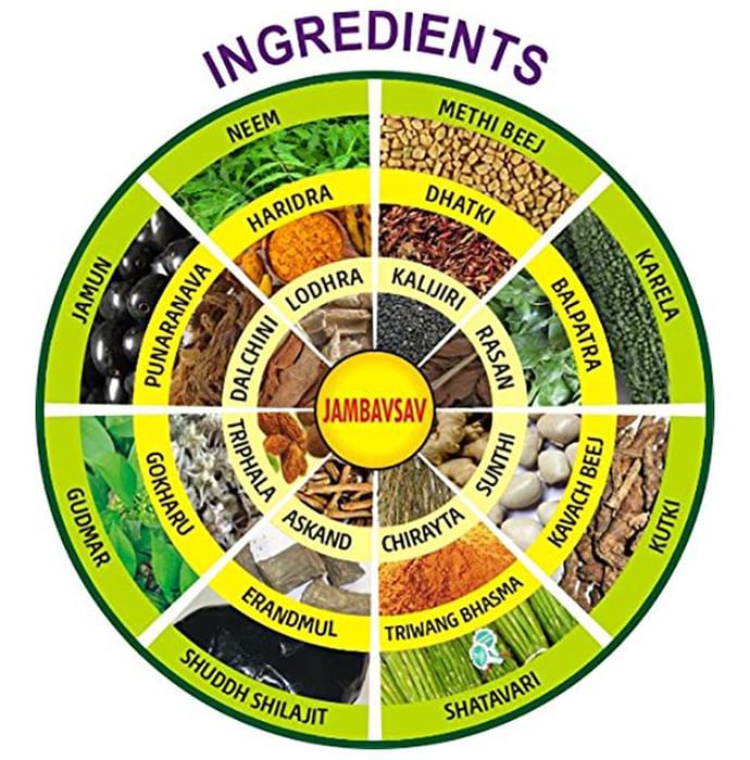 Composition : Jamun, Neem, Methi Beej, Karela, Shudha Shilajit, Gudmar, Triphala, Kutji, Bel Patra, Kawach Beej, Haridra, Triwang Bhasma, Dhataki, Gokharu, Chirayata, Kalijiri, Lodhra, Rasan, Sunthi, Askand, Dalchini, Erandmul, Punarnava.
