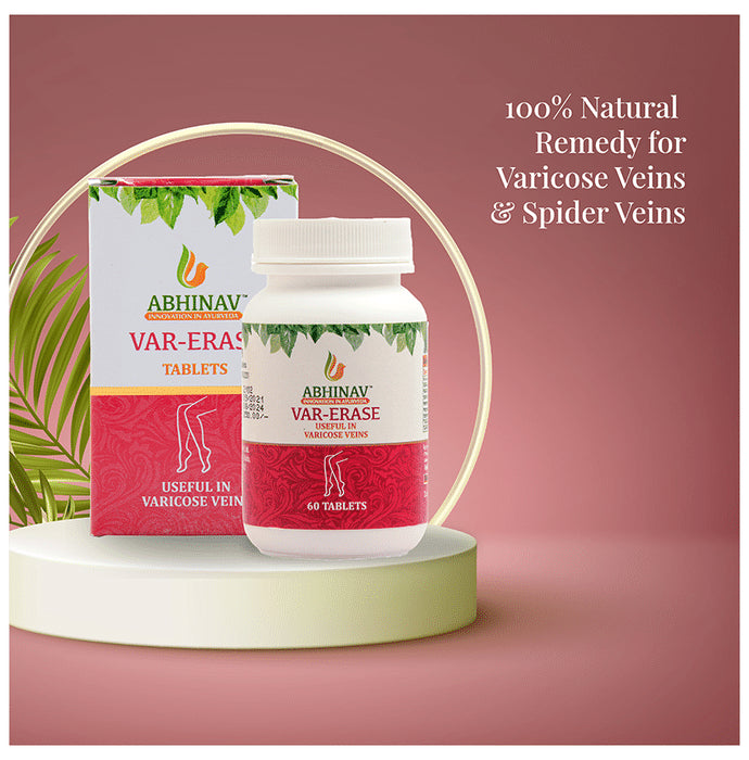 Abhinav Var-Erase Tablet is a unique combination of herbs presented as tablets for varicose veins. The critical ingredients of Var-Erase are ashwagandha extract, punarnava extract, manjistha extract, sariva extract, haridra extract, nirgundi extract, dashamool extract, triphala extract and sunthi extract. They act by their astringent, smooth muscle relaxant, and anti-inflammatory activity to improve the strength of the veins.