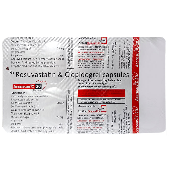 Accrosuv-C 20 Capsule is a combination of two medicines used to prevent heart attack, angina, and stroke. This medicine reduces the '__'bad'__' cholesterol (LDL) and triglycerides (fats) levels. Moreover, it also decreases the formation of harmful blood clots. Accrosuv-C 20 Capsule should be taken with or without food. You should take it regularly at evenly spaced intervals as per the schedule prescribed by your doctor. Taking it at the same time every day will help you remember to take it. The dose and duration of treatment will depend on what you are being treated for. Do not stop taking it until you have finished the complete course, even when you feel better. Lifestyle changes like low-fat diet, exercise and not smoking may help this medicine to work better.Stomach pain, diarrhea, indigestion, constipation, and headache are some common side effects of this medicine. This medicine increases your risk of bleeding, so it is important to be careful while shaving, cutting nails, using sharp objects, or engaging in contact sports (e.g., football, wrestling). Let your doctor know if you notice yellowing of skin, muscle pain or dark urine. You may be asked for regular monitoring of liver function while taking this medicine.Before taking this medicine, tell your doctor if you have liver or kidney disease or you are suffering from bleeding disorder. You must tell your doctor if you are pregnant, planning pregnancy or breastfeeding. You should also let your healthcare team know all other medicines you are taking as they may affect, or be affected by this medicine.