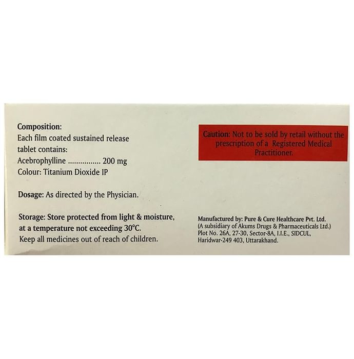 Acebull 200 SR Tablet is used to treat and prevent symptoms of asthma, bronchitis, and chronic obstructive pulmonary disorder (a lung disorder in which flow of air to the lung is blocked). It helps in relaxing the muscles of the air passages, thus widening it and making it easier to breathe. Acebull 200 SR Tablet can be taken with the food in evening. Take it at the same time every day to get the most benefit. The dose and how often you take it depends on what you are taking it for. Your doctor will decide how much you need to improve your symptoms. Take this medicine for as long as it is prescribed for you. Do not miss even a single dose, if in any case, you missed a dose, take it as soon as you remember or better to skip the missed dose and continue with regular dosing. It does not work immediately or prevent the already started breathing trouble, hence always carry your medical inhaler with you for an emergency.The most common side effects of this medicine include abdominal discomfort, abdominal distension, vomiting, abdominal pain, diarrhea, constipation, and heart burn. If these bother you or appear serious, let your doctor know. There may be ways of reducing or preventing them. Generally, it is advised not to consume alcohol or do not smoke while on treatment.Before taking this medicine, let your doctor if you have kidney or liver disease or if you have heart-related problems. Your doctor should also know about all other medicines you are taking as many of these may make this medicine less effective or change the way it works. Inform your doctor if you are pregnant or breastfeeding before starting the treatment.