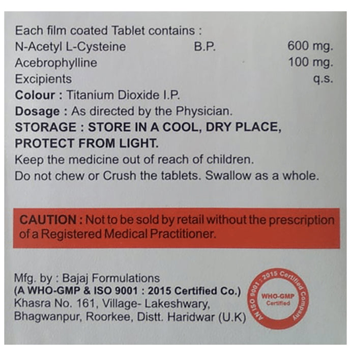 Composition : Acebrophylline (100mg) + Acetylcysteine (600mg)