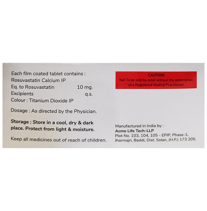 Acmerose 10 Tablet belongs to a group of medicines called statins. It is used to lower cholesterol and reduce the risk of heart disease. Cholesterol is a fatty substance that builds up in your blood vessels and causes narrowing, which may lead to a heart attack or stroke. Acmerose 10 Tablet is a widely prescribed medicine and is regarded as safe for long-term use. It can be taken with a meal or on an empty stomach. You can take it at any time of the day but try to take it at the same time each day. Most people with high cholesterol do not feel ill, but stopping your medicine may increase your cholesterol levels, making your condition worse and increasing your risk of heart disease and stroke.It is important to have your cholesterol levels checked regularly. This medicine is only one part of the treatment program which should also include a healthy diet, regular exercise, smoking cessation, moderation of alcohol intake, and weight reduction. You can eat normally while taking this medicine, but try to avoid foods that are high in fat.Common side effects of this medicine include muscle pain, weakness, nausea, headache, and stomach pain. These are usually mild and disappear after a short time. Consult your doctor if they persist or if you notice any yellowing of your eyes or get repeated or unexplained muscle pains.This medicine should not be used in conditions such as liver disease. Also, pregnant women and breastfeeding mothers should not take this medicine as it may harm the developing baby. Diabetic patients should monitor their blood sugar levels while taking this medicine, as it may lead to an increase in blood sugar levels.