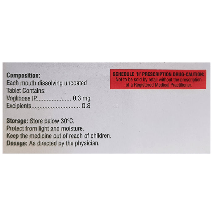 Acovog MD 0.3 Tablet is a medicine used to treat type 2 diabetes mellitus. It helps control the high blood sugar levels in your body after each meal. It is used when other similar medicines along with a restricted diet, are unable to control abnormally high blood sugar levels. Acovog MD 0.3 Tablet should be taken just before a meal. The dose and how often you need it will be decided by your doctor so that you get the right amount to control your blood sugar levels. Do not stop taking it suddenly without consulting your doctor. If you do, your blood sugar levels may increase and put you at risk of serious complications like kidney damage and blindness.This medicine is only part of a treatment program that should also include a healthy diet, regular exercise, and weight reduction as advised by your doctor. Monitor your blood sugar levels regularly while taking this medicine.The most common side effects of Acovog MD 0.3 Tablet include flatulence (gas), stomach pain, loss of appetite, constipation, and diarrhea. Consult your doctor if any of these side effects bother you or do not go away. This medicine by itself does not cause hypoglycemia (low blood sugar levels). However, when used in combination with other diabetes medicines (especially insulin or sulphonylureas), it can lead to hypoglycemia (low blood sugar levels). Such episodes of hypoglycemia will have to be treated by taking plain glucose. Table sugar or common sugar will not help correct low blood sugar levels if you are taking this medicine.Before taking it, let your doctor know if you have any kidney or liver problems. Do not take this medicine if you have ulceration or inflammation in the bowel (eg. ulcerative colitis or Crohn’s disease). Pregnant or breastfeeding women should also consult their doctor before taking it. Please tell your doctor about all the other medicines you are taking to make sure you are safe. Avoid excessive alcohol intake while taking this medicine as it may increase the risk of hypoglycemia (low blood sugar levels).