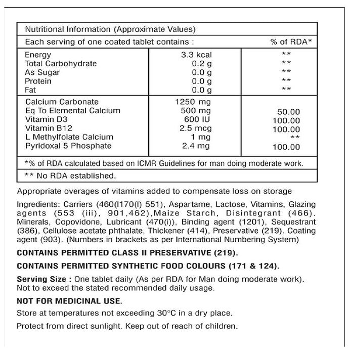 Composition : Calcium,Vitamin D3,Vitamin B12,L-methyl folate calcium,Pyridoxal 5 phosphate