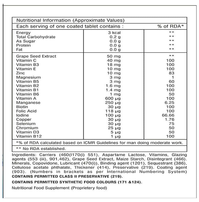 Composition : Vitamin C, Vitamin B, Vitamin E, Zinc, Magnesium, Vitamin B5, Vitamin B2, Vitamin 1 , Vitamin B6, Vitamin A, Manganese, Biotin, Folic acid, Iodine, Copper, Selenium, Chromium, Vitamin D3, Vitamin B12