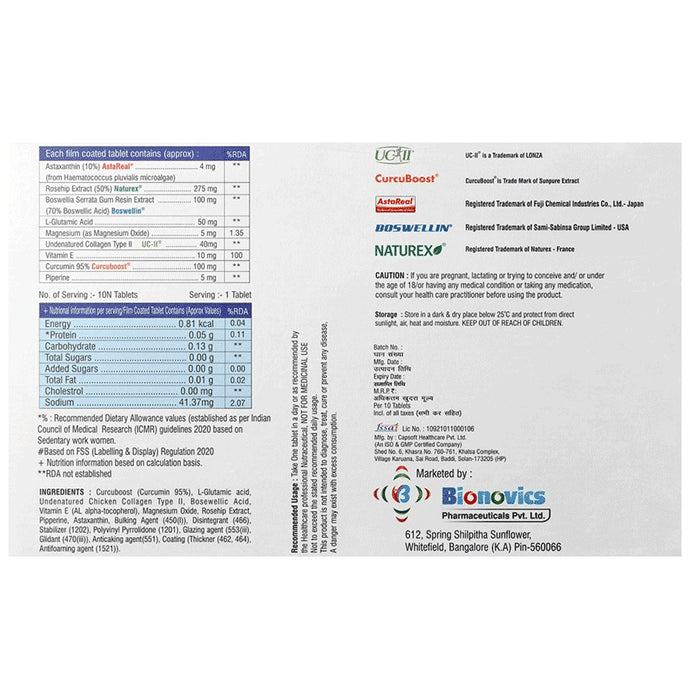 Composition : Astaxanthin (10%) AstaReal4 mg (extract from Haematococcus pluvialis microalgae) Rosehip Extract 50 % Naturex 275 mg Boswellia Serrata Gum Resin Extract 100 mg (70% Boswellic Acid) Boswellin,L-Glutamic acid 50 mg Magnesium (as Magnesium Oxide). 5 mg 1.35 Undenatured Collagen Type II UC-II . 40mg Vitamin E . 10 mg 100 Curcumin 95% Curcuboost® 100 mg Bioperine 5MG