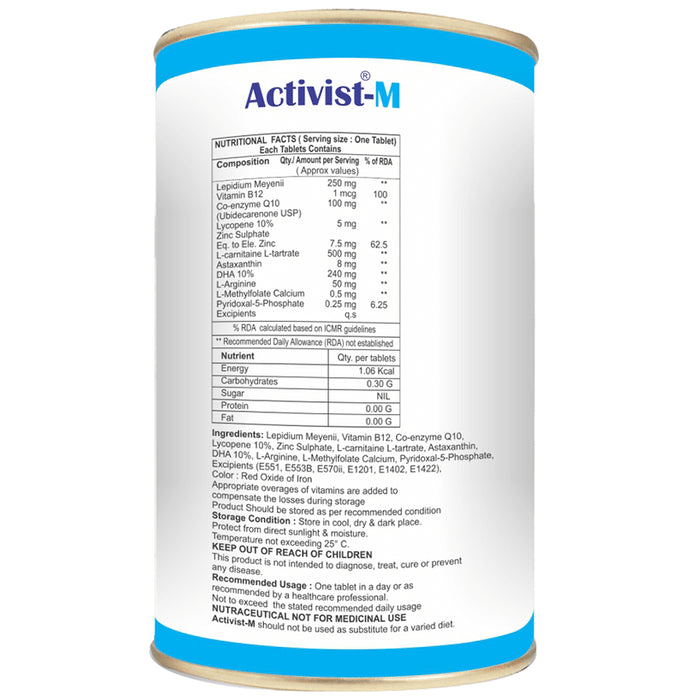Activist-M Tablet assists men in enhancing fertility and lowers fatigue and weariness. Each tablet contains essential vitamins, minerals, enzymes, and other essential nutrients. It is beneficial for boosting fertility in men. Lycopene is a powerful antioxidant with numerous health advantages, including sun protection and better heart health. It contains vitamin mineral that helps to make your skin glow and clear.