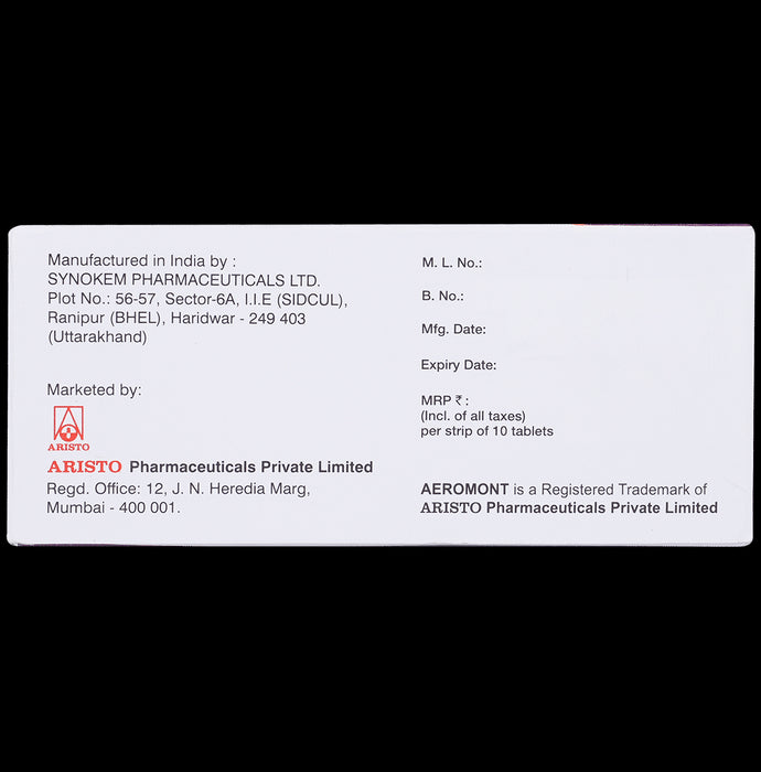 Aeromont-B Tablet is a combination of two medicines. It is used in the treatment of various allergic conditions. It reduces inflammation (redness, tenderness, heat, and swelling), itching, and rashes by blocking certain chemical messengers in the body. Aeromont-B Tablet may be taken with or without food. The dose may vary depending on what you are taking it for. Take it as it has been prescribed by your doctor. You may need this medicine only on days you have symptoms, or as prescribed by your doctor. If you stop taking it earlier than advised, your symptoms may come back.Common side effects include headache, pharyngitis, cough, abdominal pain, diarrhea, and otitis media. If you experience any of these that persist or bother you, let your doctor know. Before taking it, you should tell your doctor if you have any problems with your liver or kidneys or with your heart to make sure it is safe for you. Pregnant or breastfeeding women should also consult with their doctor before taking it.
