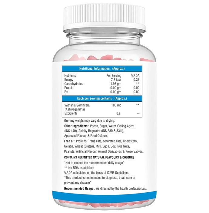 Composition : Ashwagandha (Withania Somnifera): 100 mg,Other Ingredients: Sorbitol, Sugar, Water, Gelling Agent (INS 440), Acidity Regulator (INS 330 and 331), Approved Flavour and Food Colours