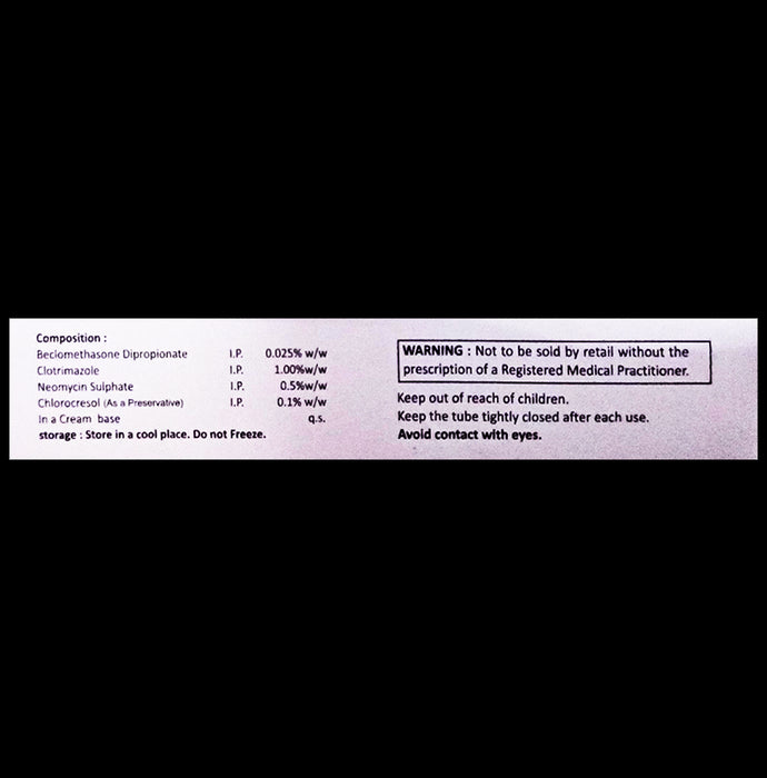Composition : Beclometasone (0.025% w/w) + Neomycin (0.5% w/w) + Clotrimazole (1.00% w/w)