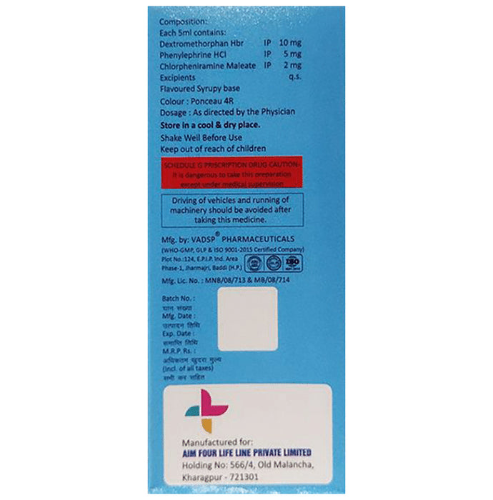 Composition : Phenylephrine (5mg/5ml) + Chlorpheniramine Maleate (2mg/5ml) + Dextromethorphan Hydrobromide (10mg/5ml)