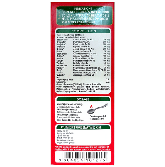 Composition : Daruharidra (Berberis aristata DC.), Guduchi (Tinospora cardifolia (Willd.) Miers), Neem (Azadirachta indica), Chirayata (Swertia chirata Buch.), Manjistha (Rubia cordifolia L.), Mundi (Sphaeranthus indicus), Babul (Acacia nilotica (L.) ), Nagarmotha (Cyperus scariosus), Gokhru (Tribulus Terrestris L), Sariva / Anantmool (Hemidesmus indicus), Inderjav (Holarrhena pubescens Wall. ex G.Don ), Kutaki (Picrorhiza kurroa Royle ex Benth)