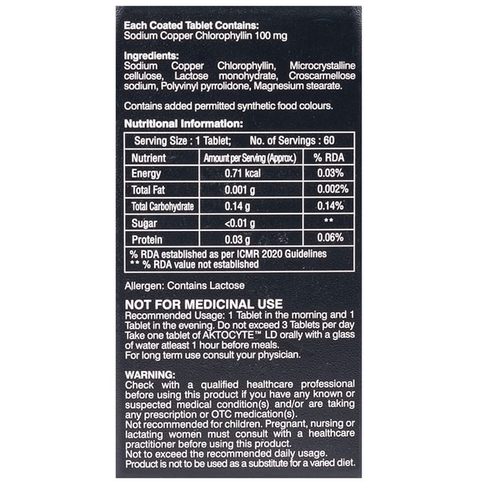 Aktocyte 100mg Tabletis a health supplement containing Sodium Copper Chlorophyllin, designed to act as an internal deodorant. It is suitable for supporting overall well-being by promoting internal freshness. This supplement comes in tablet form and is intended for daily use.