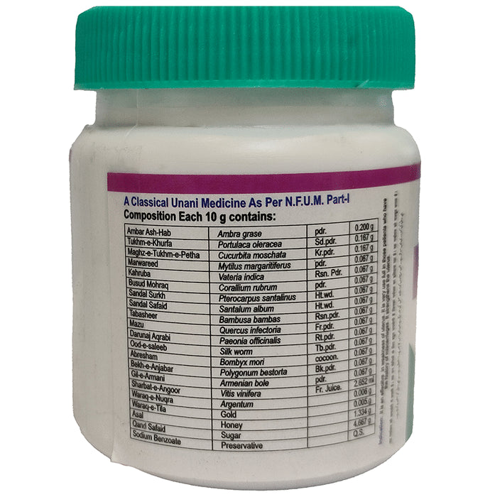 Composition : Ambar Ash-Hab, Tukhm-e-Khurma, Sandal Surkh, Abresham, Marwareed, Kahruba, Mazu, Sandal Safaid, Tabasheer, Ood-e-saleeb