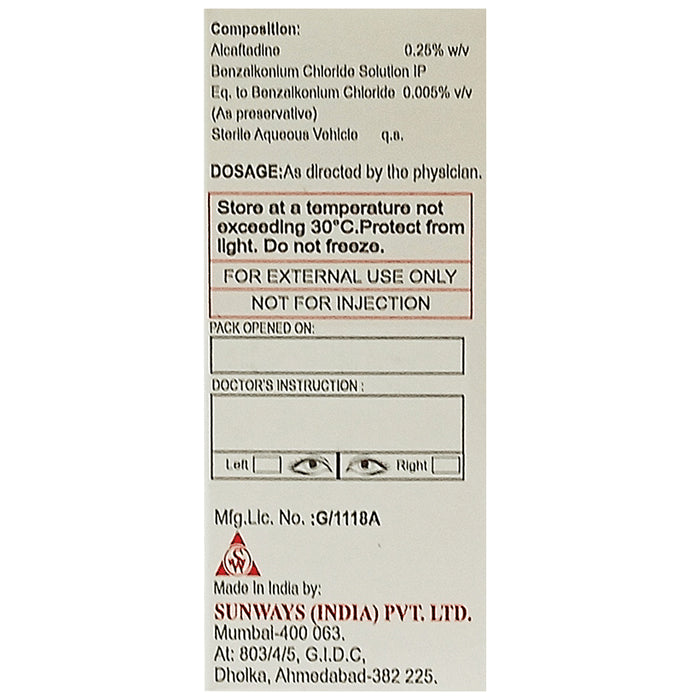 Alcatop Eye Drop is an antihistaminic medication. It is used to treat inflammation of eyes (redness and swelling) caused due to various allergies. It helps in short-term or sudden allergic reactions in the eye. Follow your doctor’s instructions precisely for administering Alcatop Eye Drop in the eye. It should be used regularly at evenly spaced time intervals as prescribed by your doctor. Do not skip any doses and finish the full course of treatment even if you feel better. Stopping the medicine too early may lead to the returning or worsening.Commonly seen side effects seen with this medicine include temporary eye irritation and burning sensation after administration. Consult your doctor if these side effects persist or if your condition worsens. It may cause blurring of your vision for a short time just after its use, so not drive until your vision is clear.