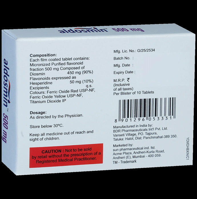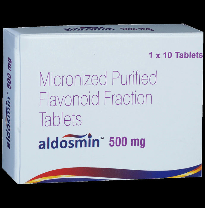 Aldosmin 500mg Tablet is a combinational medicine used in the treatment of varicose veins and acute and chronic piles (hemorrhoids). It improves blood flow in the veins and restores its function. Aldosmin 500mg Tablet can be taken with or without food in a dose and duration as advised by the doctor. You should keep taking this medicine for as long as your doctor recommends. If you stop treatment too early your symptoms may come back and your condition may worsen.The most common side effects are itching, stomach pain, nausea, vomiting, indigestion, and dizziness. Most of these are temporary and usually resolve with time. Contact your doctor straight away if you are at all concerned about any of these side effects. This medicine may also cause diarrhea, so it is better to take plenty of fluids while taking this medicine as it may help to prevent dehydration. Lifestyle modifications like reducing smoking, increasing exercise and a healthy diet will help you to get better results.Pregnant or breastfeeding women should consult their doctor before taking this medicine. You should let your doctor know if you have liver or kidney heart problems. Let your doctor know about all other medications you are taking as some may affect, or be affected by this medicine.