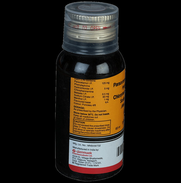 Alex P Syrup is used in the treatment of common cold and cough associated with fever in children. It provides relief from pain and fever and helps treat cough and common cold symptoms like runny nose, stuffy nose, and sneezing. Alex P Syrup may be given to your child with or without food. Give it in a dose and duration as advised by the doctor. The dose and duration of the treatment will depend on your child’s condition and how they respond to the medicine. Continue to administer the medicine for as long as the doctor has recommended.The most common side effects are nausea, vomiting, and headache. Most of these are temporary and usually resolve with time. Contact the doctor straight away if you are at all concerned about any of these side effects experienced by the child. This medicine can also cause sleepiness, so do not let your child do anything that requires mental focus until you know how this medicine affects them.It is beneficial to have plenty of fluids while taking Alex P Syrup. Before giving the medicine to your child, let your doctor know if they have any kidney or liver diseases so that your doctor can prescribe a suitable dose for the child.