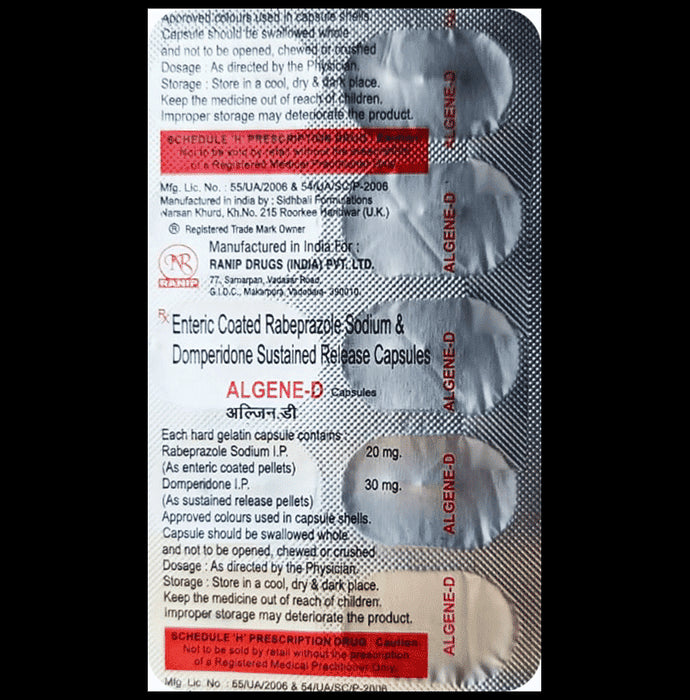Algene-D Capsule SR is a combination medicine used to treat gastroesophageal reflux disease (Acid reflux). It works by relieving the symptoms of acidity such as heartburn, stomach pain, or irritation. It also neutralizes the acid and promotes easy passage of gas to reduce stomach discomfort. Algene-D Capsule SR is taken without food in a dose and duration as advised by the doctor. The dose you are given will depend on your condition and how you respond to the medicine. You should keep taking this medicine for as long as your doctor recommends. If you stop treatment too early your symptoms may come back and your condition may worsen. Let your healthcare team know about all other medications you are taking as some may affect, or be affected by this medicine.The most common side effects are diarrhea, stomach pain, dryness in the mouth, headache, flatulence, and weakness. Most of these are temporary and usually resolve with time. Contact your doctor straight away if you are at all concerned about any of these side effects. This medicine may cause dizziness and sleepiness, so do not drive or do anything that requires mental focus until you know how this medicine affects you. Avoid drinking alcohol while taking this medicine as it can worsen your sleepiness. Lifestyle modifications like having cold milk and avoiding hot tea, coffee, spicy food or chocolate can help you to get better results.Before you start taking this medicine it is important to inform your doctor if you are suffering from kidney or liver disease. You should also tell your doctor if you are pregnant, planning pregnancy or breastfeeding.