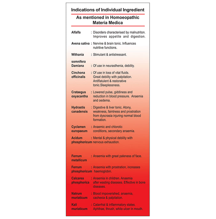 Composition : Ferrum metallicum,Ferrum phosphoricum,Calcarea phosphorica,Natrum muriaticum,Kali muriaticum,Alfalfa,Avena sativa