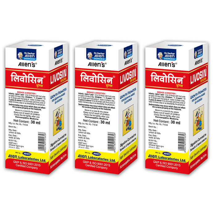 Allen's Livosin Drops (30ml Each)is a homoeopathic drop that promotes growth in babies and children. It stimulates appetite, boosts digestion and improves flatulence and constipation in growing babies. It ensures increased absorption of nutrients from the food that aids the overall development of children.