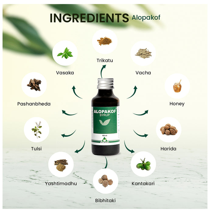 Alopakof Cough Syrup relieves stubborn nagging coughs and promotes easy expectoration. It calms the cough centre, soothes irritated mucosa, liquefies, expels thick mucus, and induces bronchial ventilation. The best thing about this syrup is that it does not show side effects.