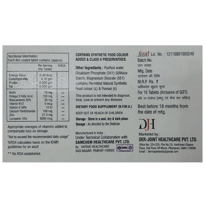 Composition : Biotin, omega 3 fatty acids, beta carotene, vitamin B12, calcium pantothenate, vitamin E, zinc, lycopene.